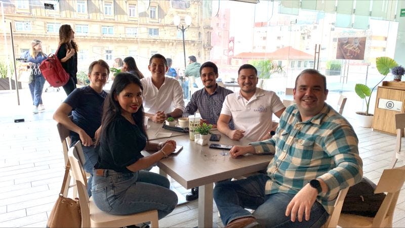 La fila avanzaba lento, pero dio tiempo suficiente para que Aaron entrara a la cafetería y tomara asiento en una mesa. Pocos minutos después, me acercó para saludarlo y presentarme con el. Aaron muy contento, me pregunta: !Hola Guillermo, mucho gusto! Cuéntame, ¿en que andas?
